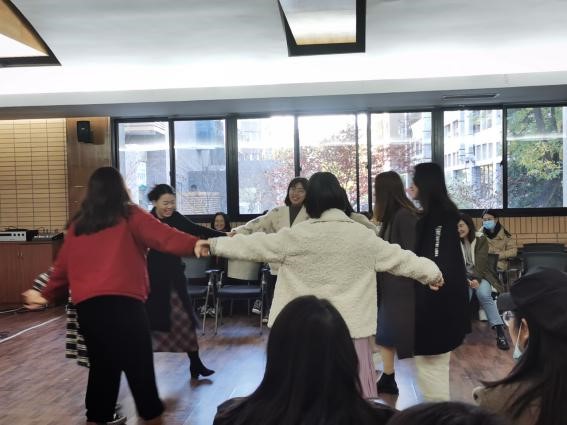 轻松愉快的破冰环节,孙老师带领本科新生充分互动,在分享各自名字的寓意、喜欢的歌曲、电影台词、偶像等的过程中相互熟悉起来,提升集体的凝聚力;汉硕2组的同学们在咨询师的鼓励下,随着欢快的音乐舞动身体,体验音乐与身心的奇妙联结。