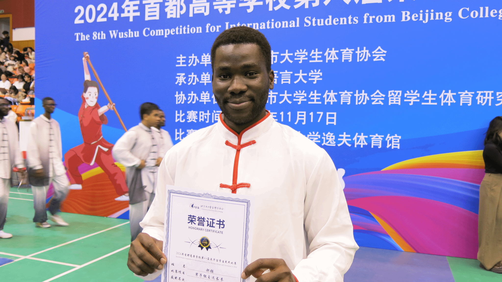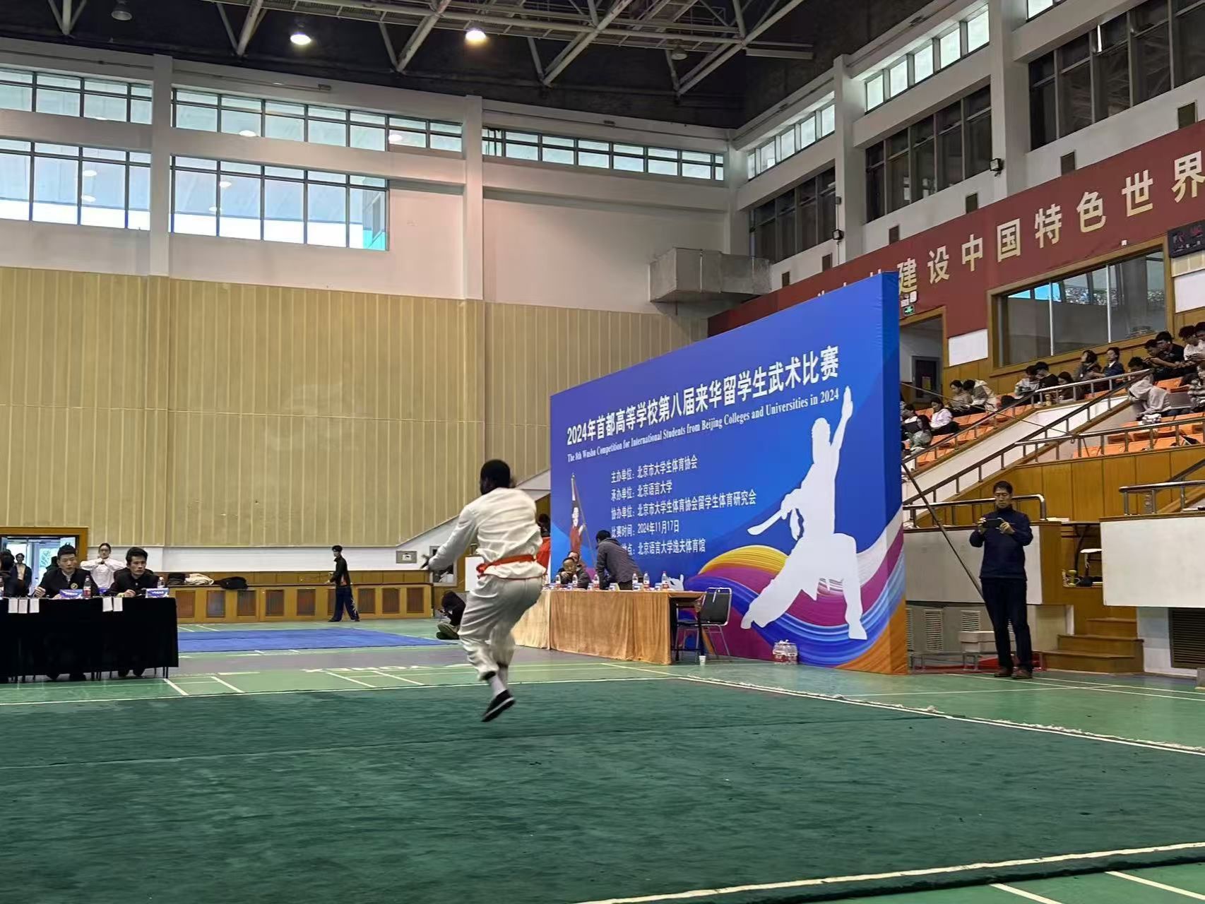 11月17日(周日)下午,首都高等学校第八届来华留学生武术比赛在北京语言大学逸夫体育馆圆满落幕。本次比赛由北京市大学生体育协会主办,北京语言大学承办,北京市大学生体育协会留学生体育研究会协办。来自清华大学、北京大学、北京理工大学、北京外国语大学等十七所在京高校的141名国际学生武术健儿参与20多个分项赛事,切磋技艺,以武会友。