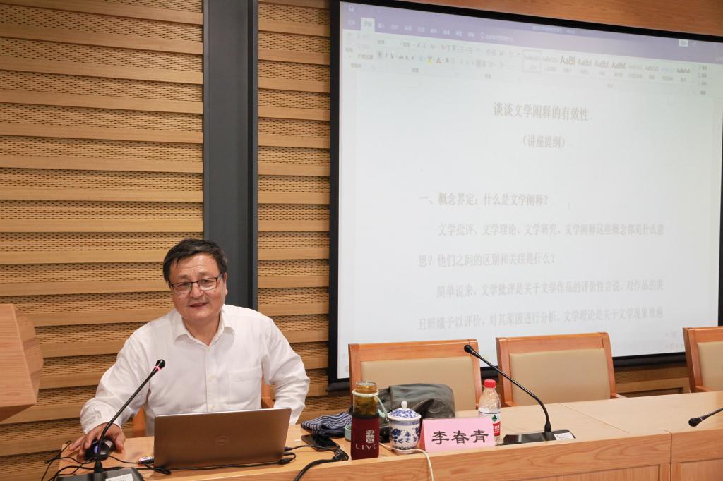 2021年5月19日下午,华南师范大学文学院特聘教授、博士生导师,中国中外文学理论学会副会长、中国文学理论学会副会长、中国文艺评论家协会理事李春青先生在校图书馆三层学术报告厅为全校师生带来了题为《谈谈文学阐释的有效性》的讲座,讲座由中文学院李建盛教授主持,中文学院院长詹福瑞教授以及部分老师到会聆听。