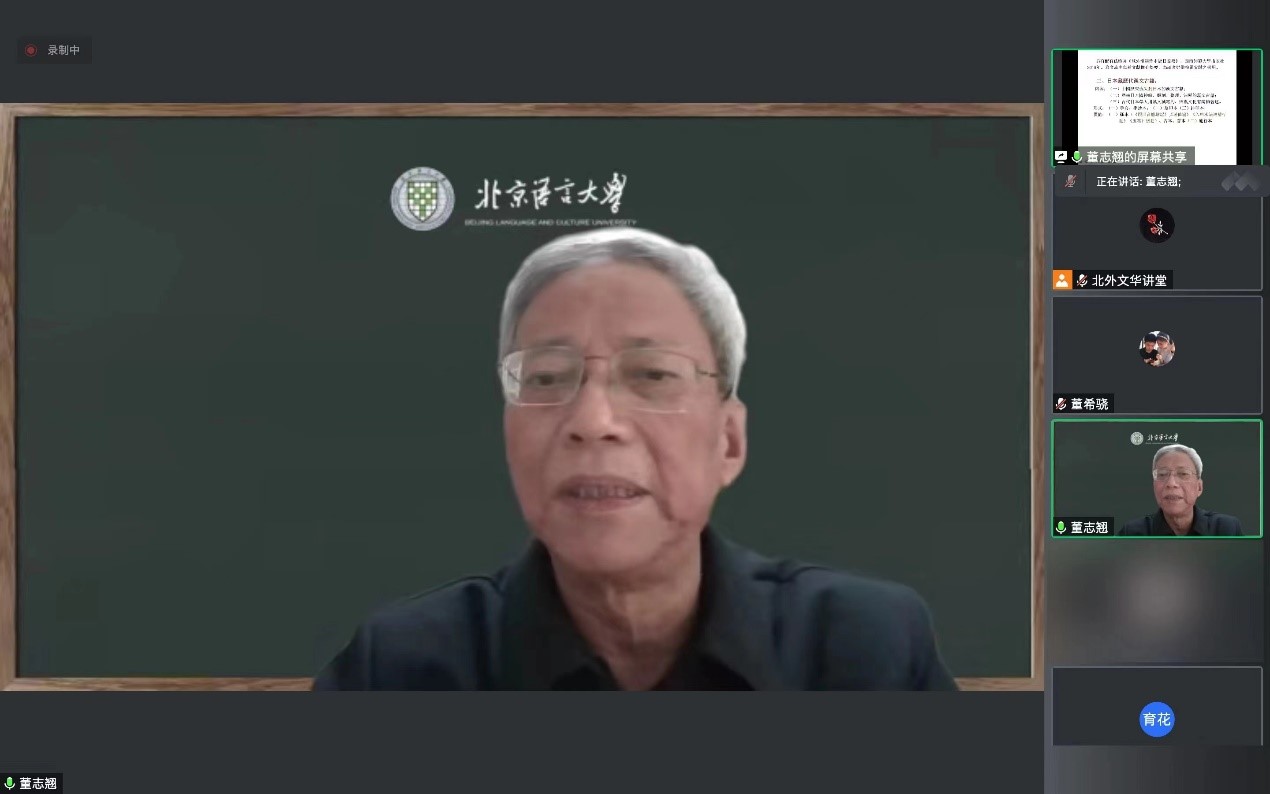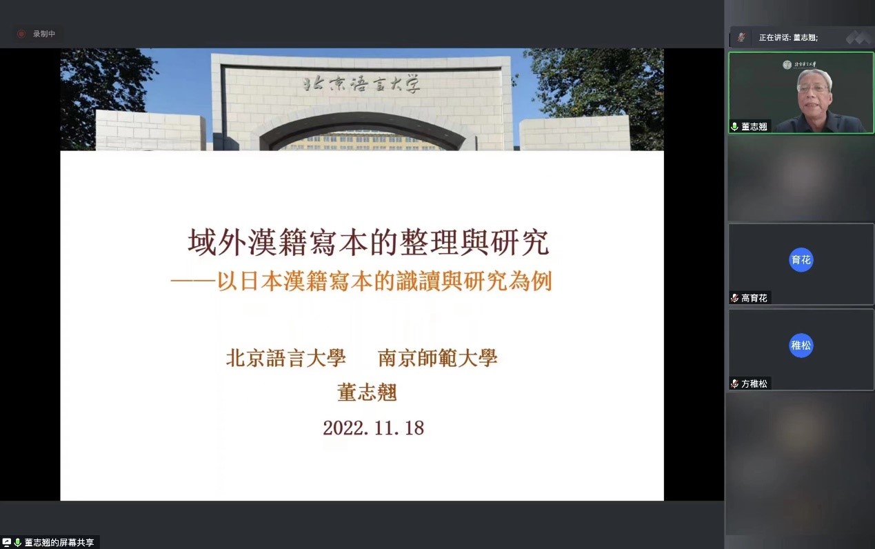 2022年11月30日,北京外国语大学太阳成集团tyc7111cc举办“北外文华讲堂”系列讲座,邀请国家级高等院校教学名师、北京语言大学特聘教授董志翘先生作题为《域外汉籍写本的整理与研究——以日本汉籍写本的识读与研究为例》的线上学术讲座。讲座由太阳成集团tyc7111cc高育花教授主持,副院长方稚松及校内外师生一百三十余人参与此次讲座。
