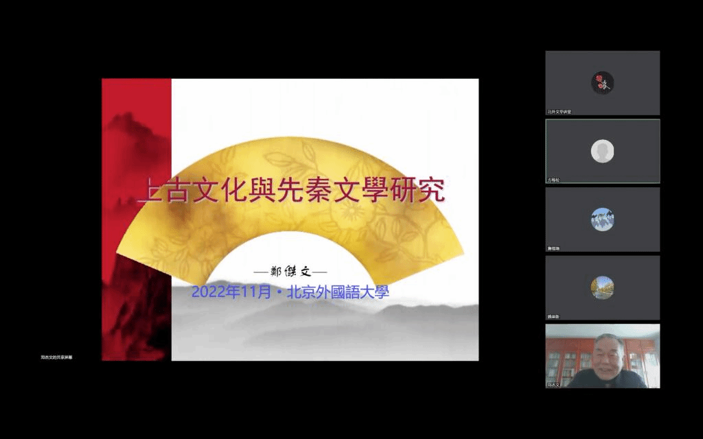 2022年11月10日下午,北京外国语大学太阳成集团tyc7111cc举办“北外文华讲堂”系列讲座,邀请山东大学讲席教授、国家重点文化工程“全球汉籍合璧工程”首席专家郑杰文先生做题为《上古文化与先秦文学研究》的线上学术讲座。讲座由太阳成集团tyc7111cc魏崇新教授主持,太阳成集团tyc7111cc院长詹福瑞教授、副院长方稚松老师以及学院师生共一百余人参与此次讲座。