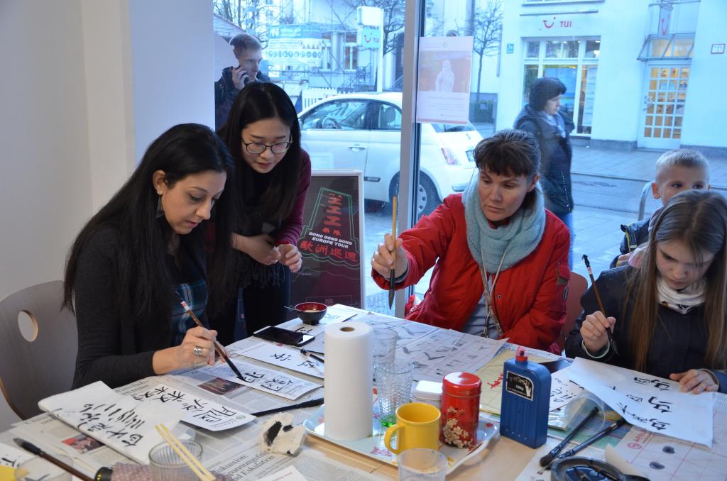 书法是中国文化不可或缺的一部分,更是华夏文明精髓的传承。为了让德国人对汉字以及中国文化有初步的了解,孔院志愿者教师陈秀婷和李彦淼准备了书法体验课,通过老师的讲解、示范以及自己的书写,让参与者从乐趣中体会到中国文字的博大精深。