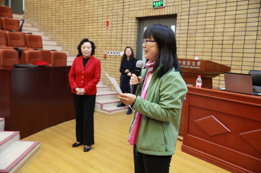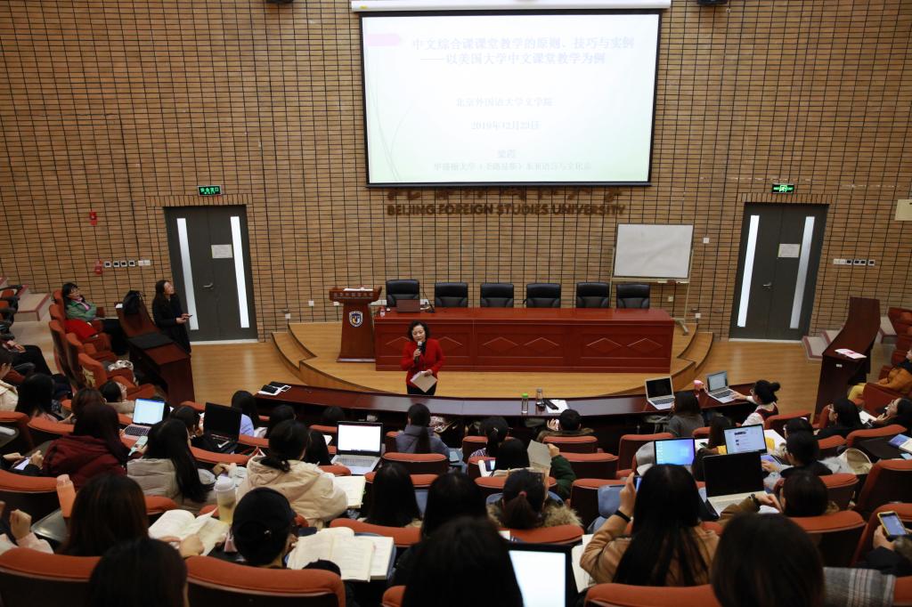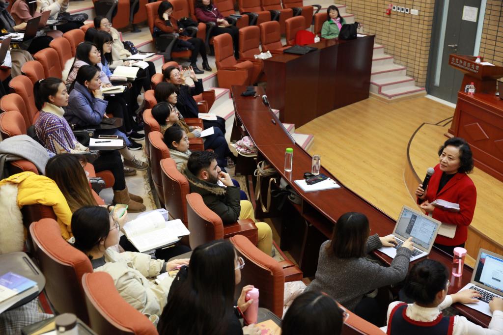 2019年12月23日下午,旅美汉语教学专家梁霞教授在我院做了题为“中文综合课课堂教学的原则、技巧与实例——以美国大学中文课堂教学为例”的讲座。讲座由我院副院长高育花教授主持,我院教师和2018、2019级汉语国际教育在校硕士生参加了此次讲座。