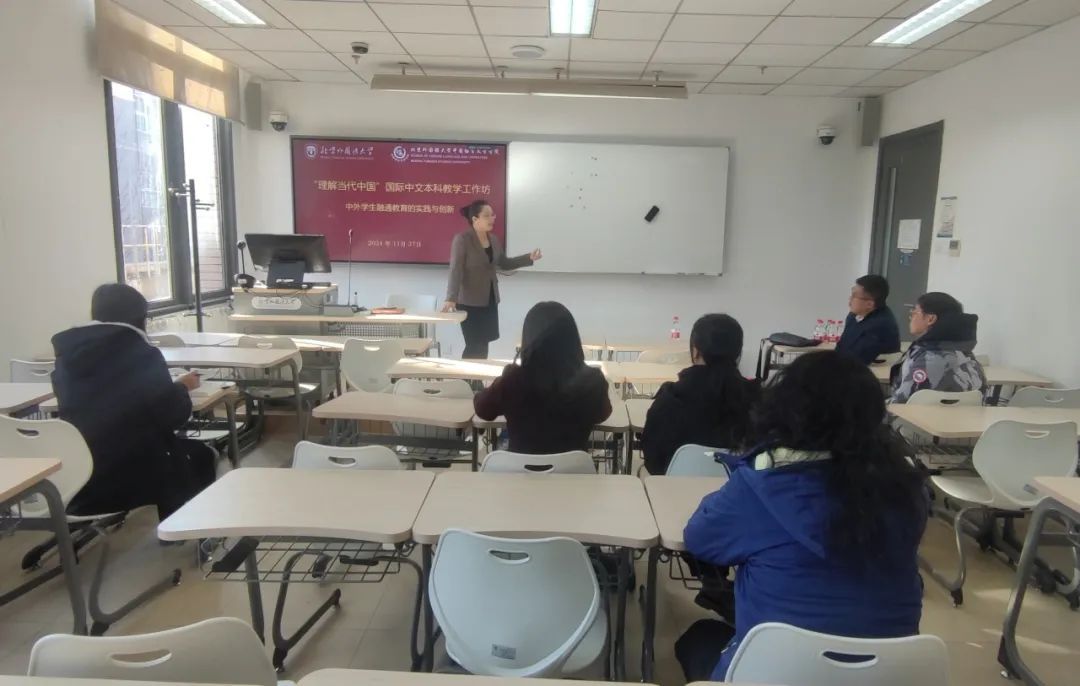 首先,刘伟光副主任做了题为“以趋同化为特色的北京理工大学来华留学工作介绍”的主题报告,介绍了北京理工大学留学工作的整体概况,提出“中外学生统一部署、人才培养一体推进”的教育治理模式,并从教育教学、文化浸润、协同管理、服务保障四个方面探讨了北京理工大学在中外学生同质化培养方面取得的成果。他表示,要从学校和教师层面统筹管理,部门协同,树立正确的教育理念,完善教育管理体系,培养知华友华人才,做强留学中国品牌。随后,刘伟光副主任和学院蔡芝芳书记、白亮副院长、曹文婷副书记以及全体与会教师就中外学生趋同培养方案、课程建设、教学改革问题进行了深入的交流。